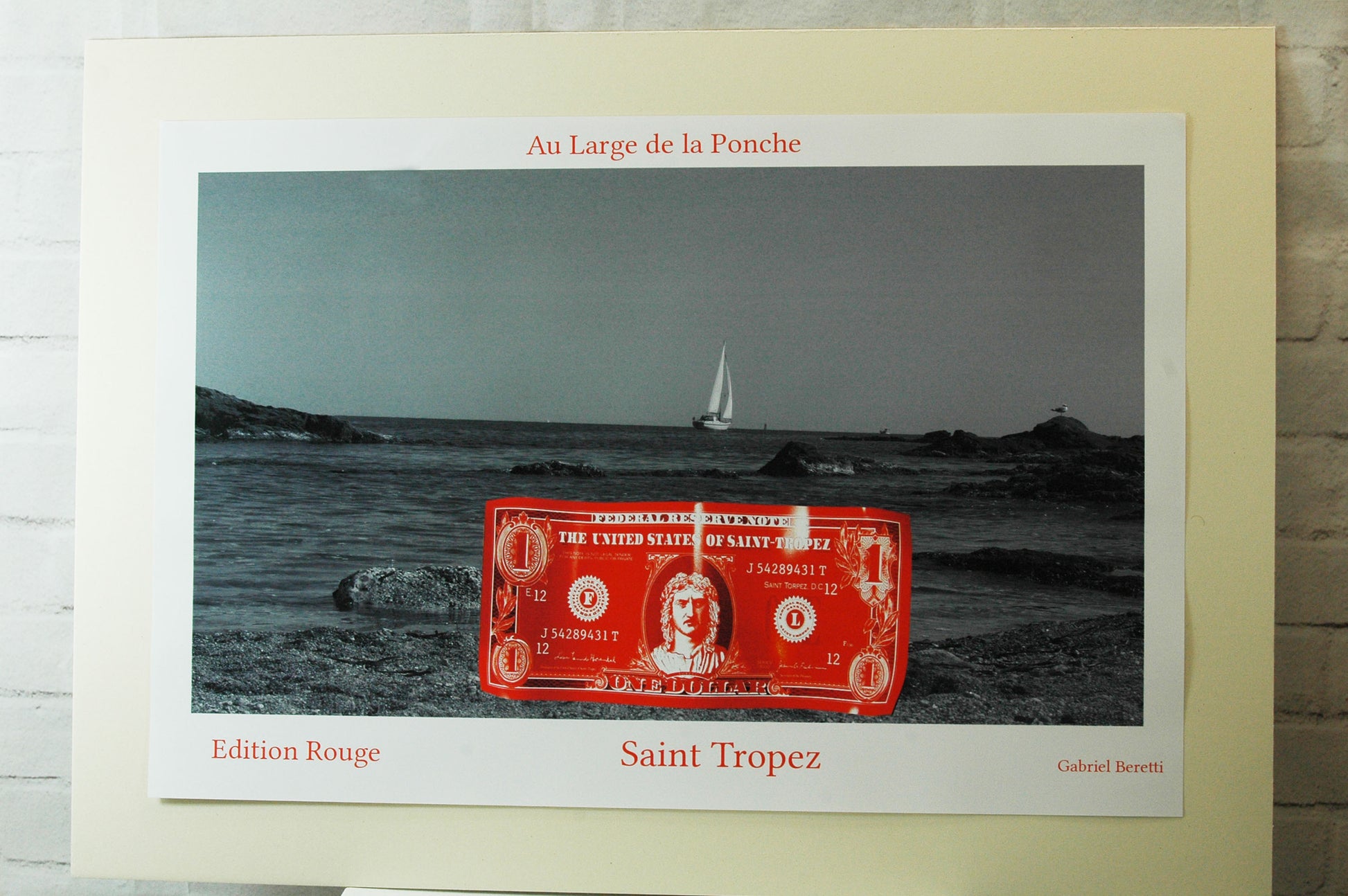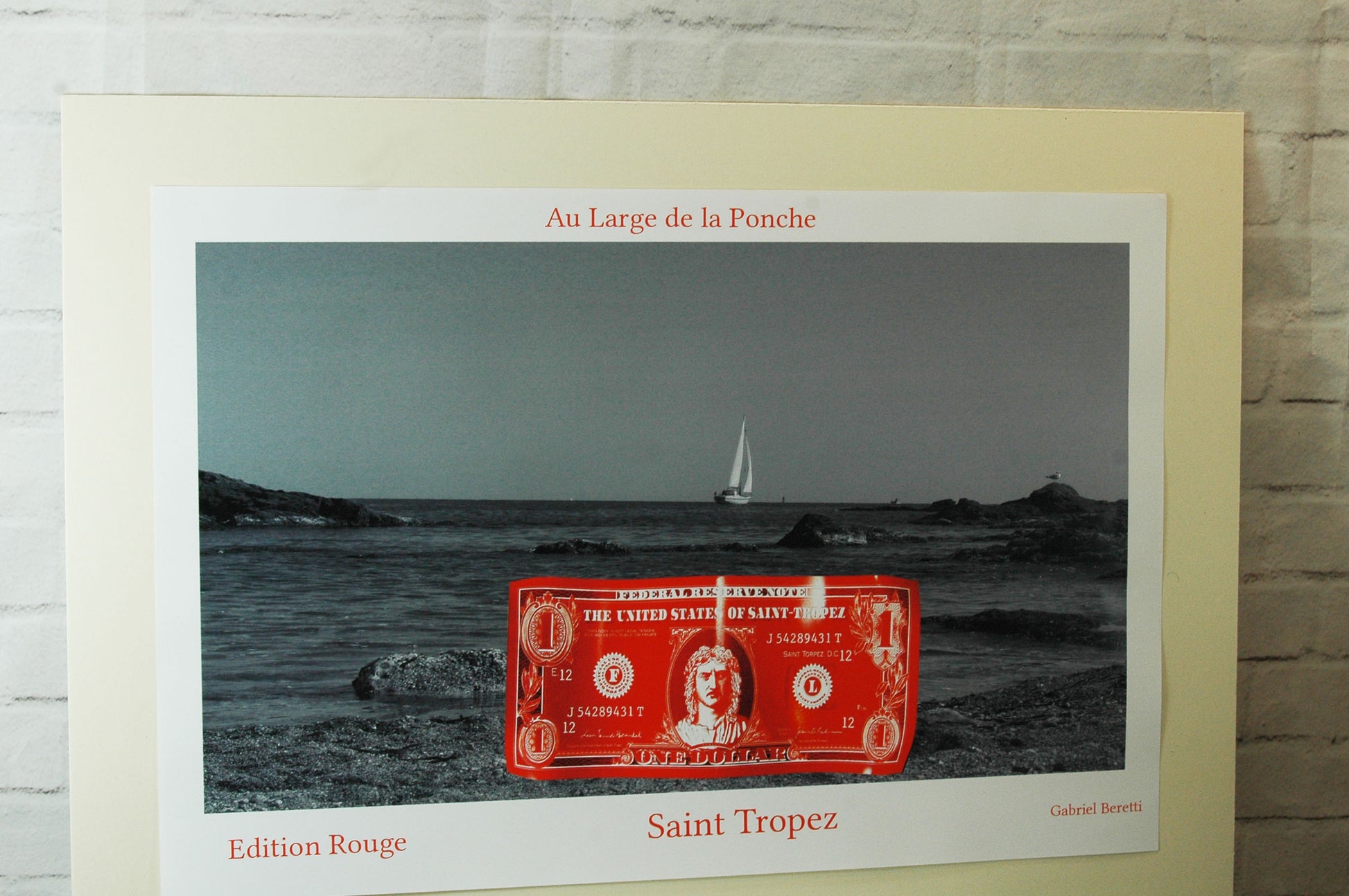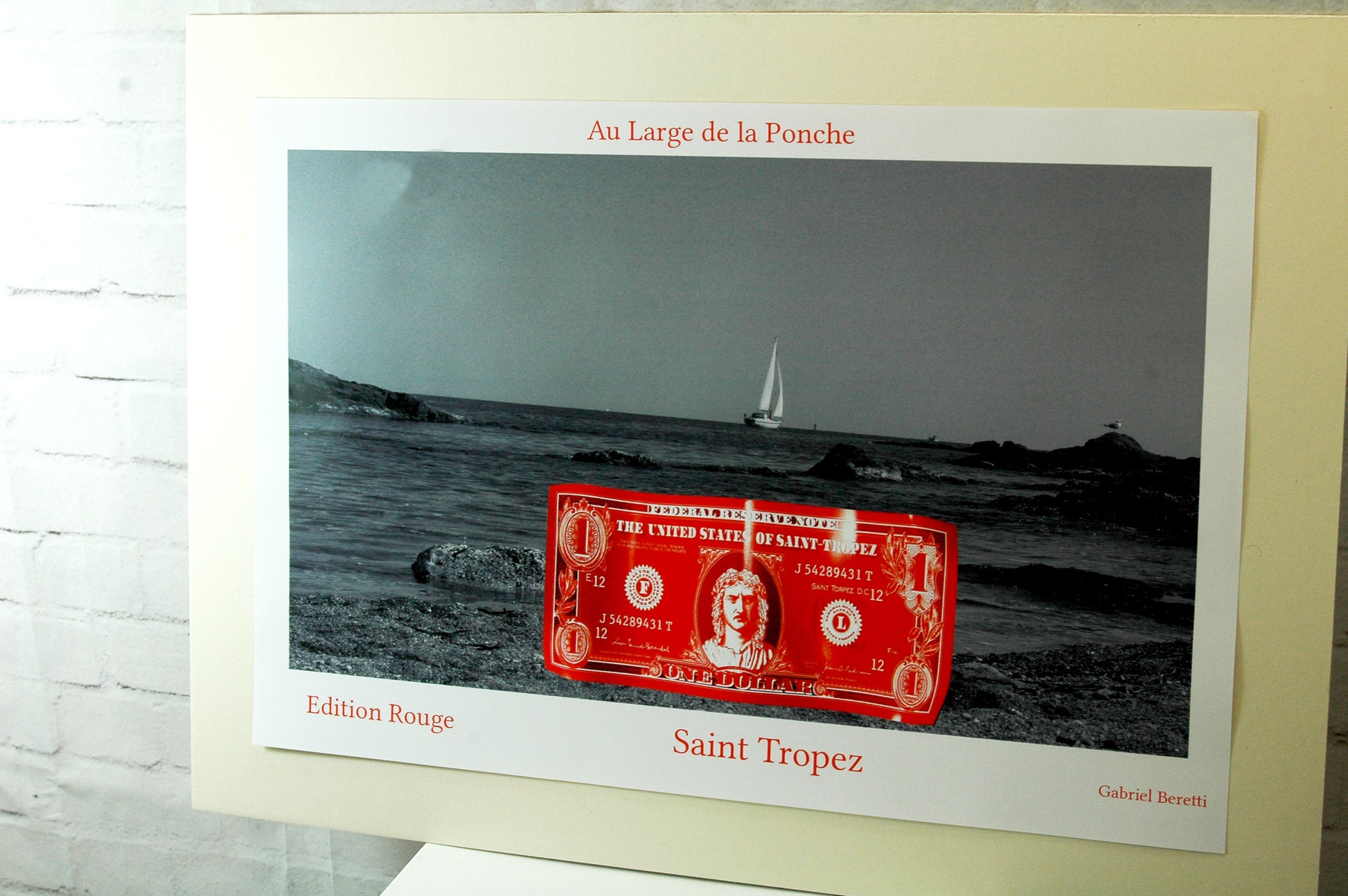 “Au large de la Ponche” est un beau regard sur la mer, au large, face à la Ponche où l’on peut admirer un superbe et noble voilier sortant du port de ST Tropez. Sur le sable, on distingue le dollar Tropézien dans son édition bleue, porte bonheur à celui qui va l’acquérir.