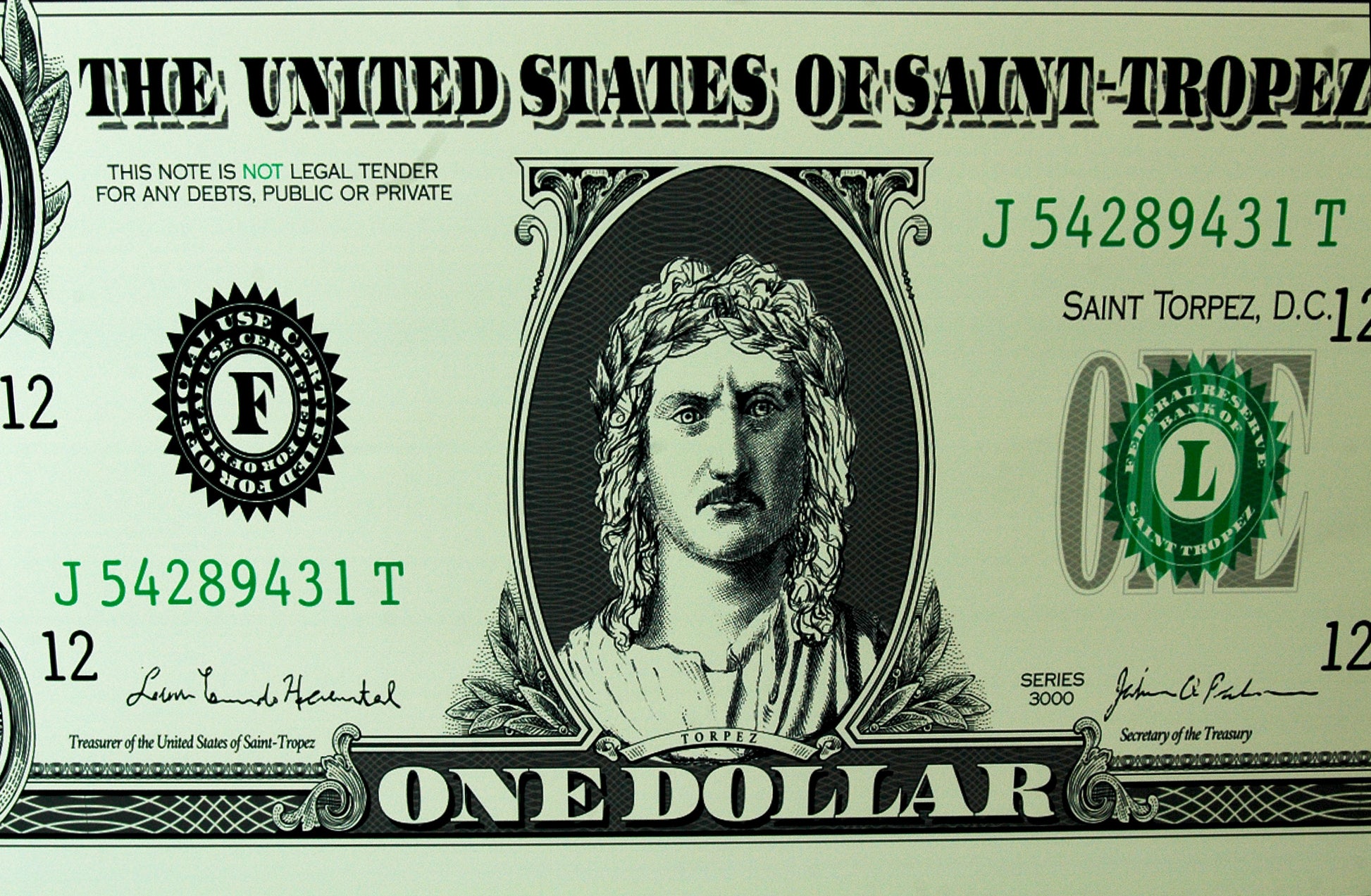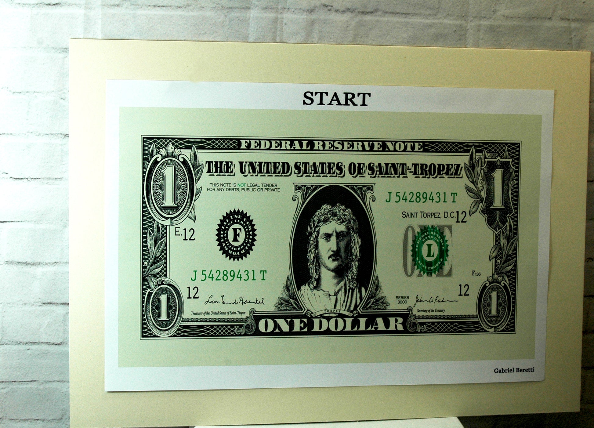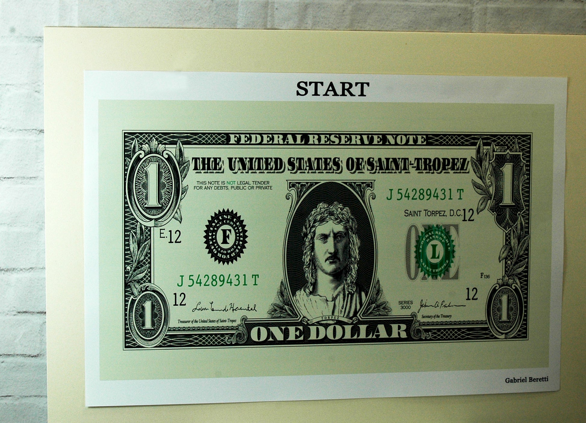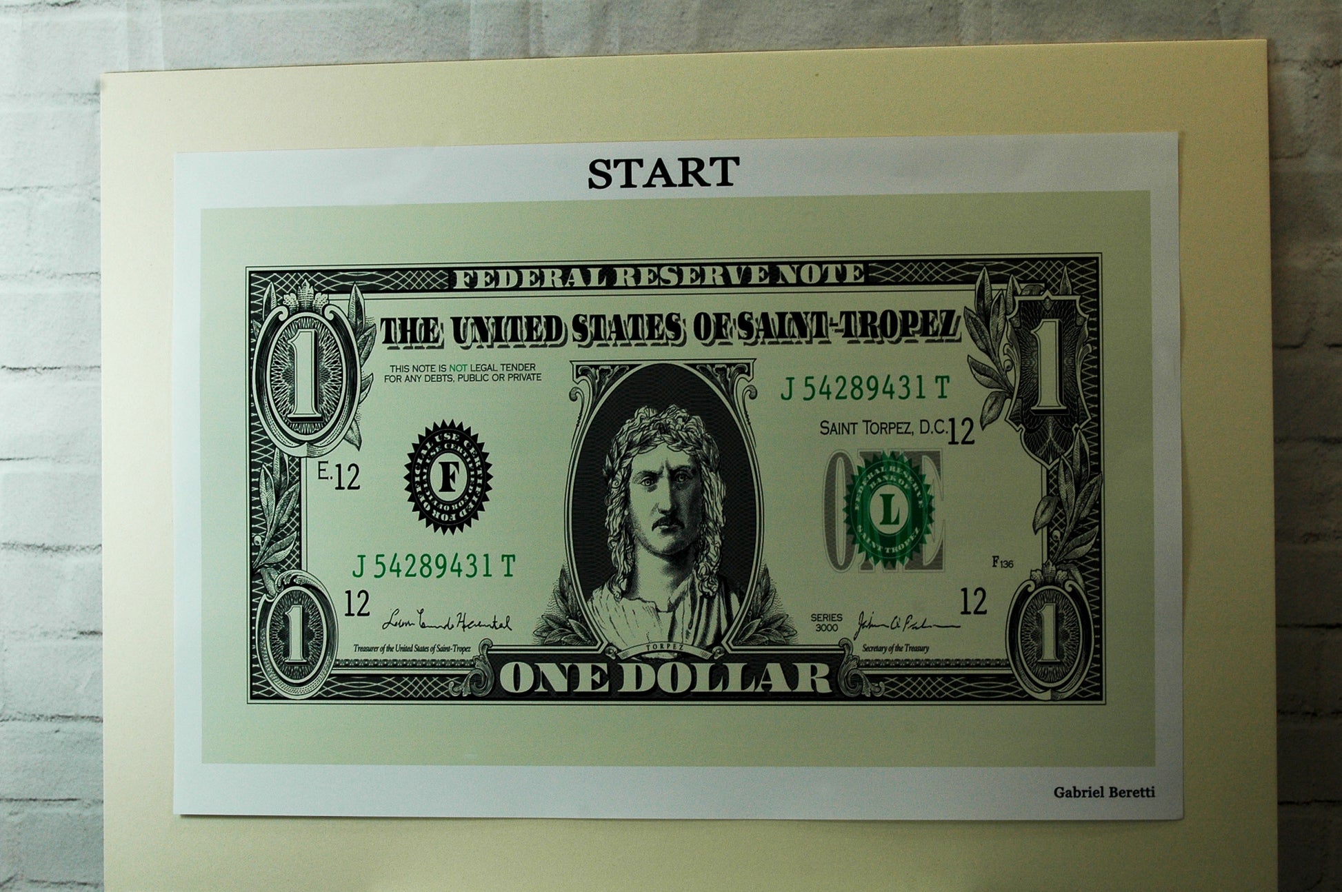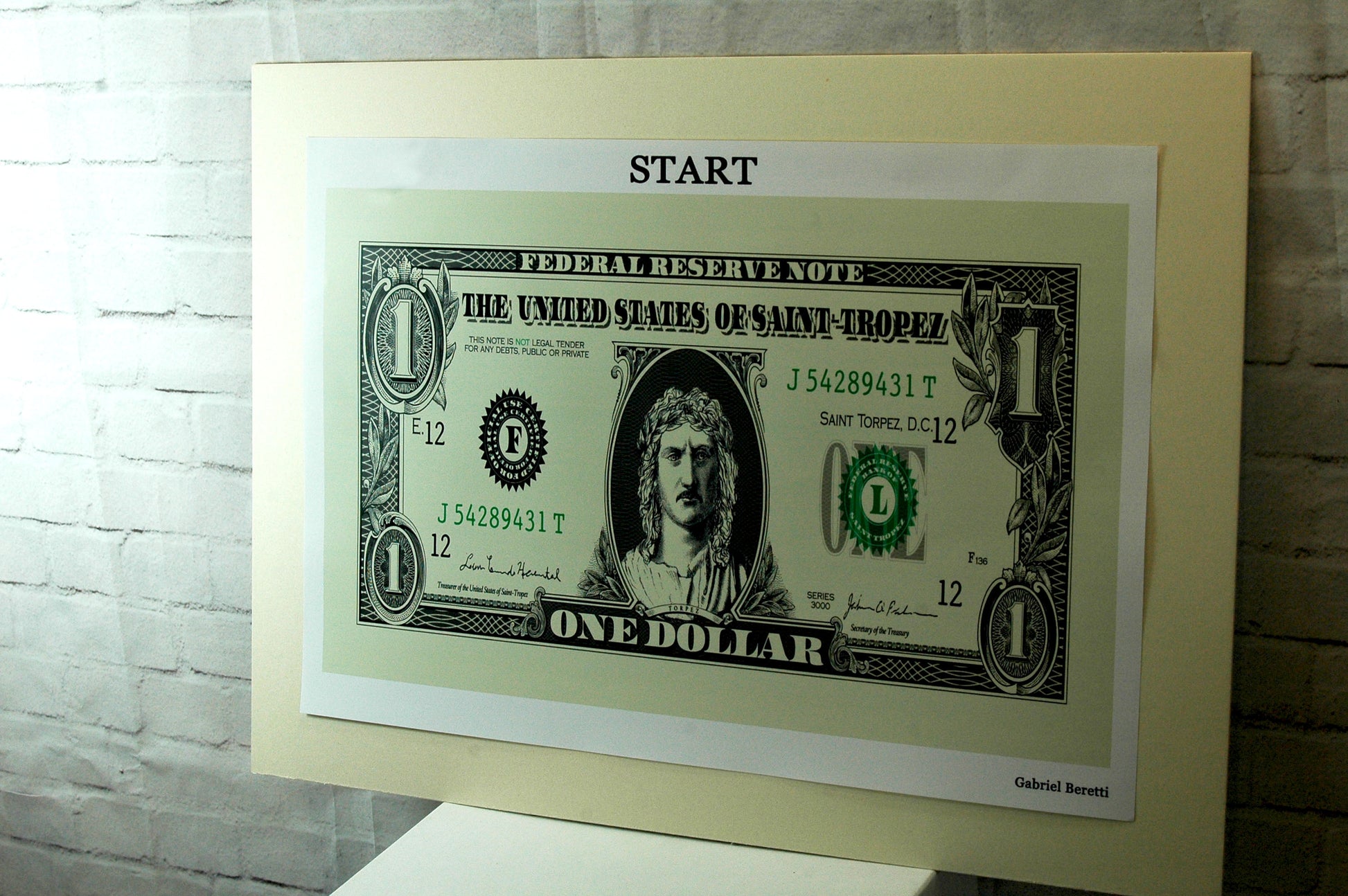 “We trust to ST Tropez” en acquérant la monnaie imaginaire Tropézienne avec ce billet d’1 dollar, accessible aux habitants de ST Tropez, un contrat de confiance pour créer ensemble la richesse d’une valeur commune. Une oeuvre symbolique d’union et de partage porte bonheur, dans l’univers de Gabriel.