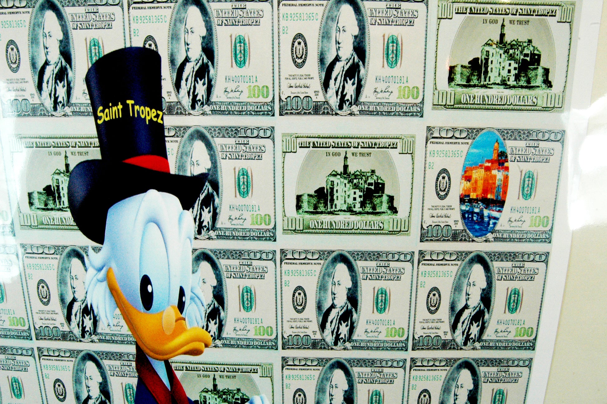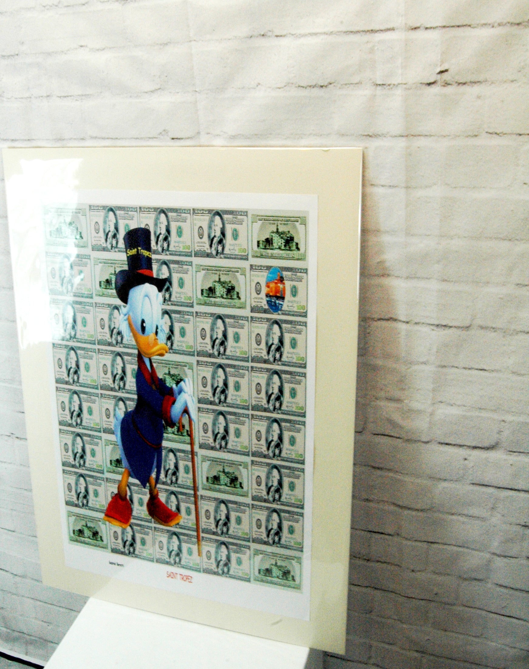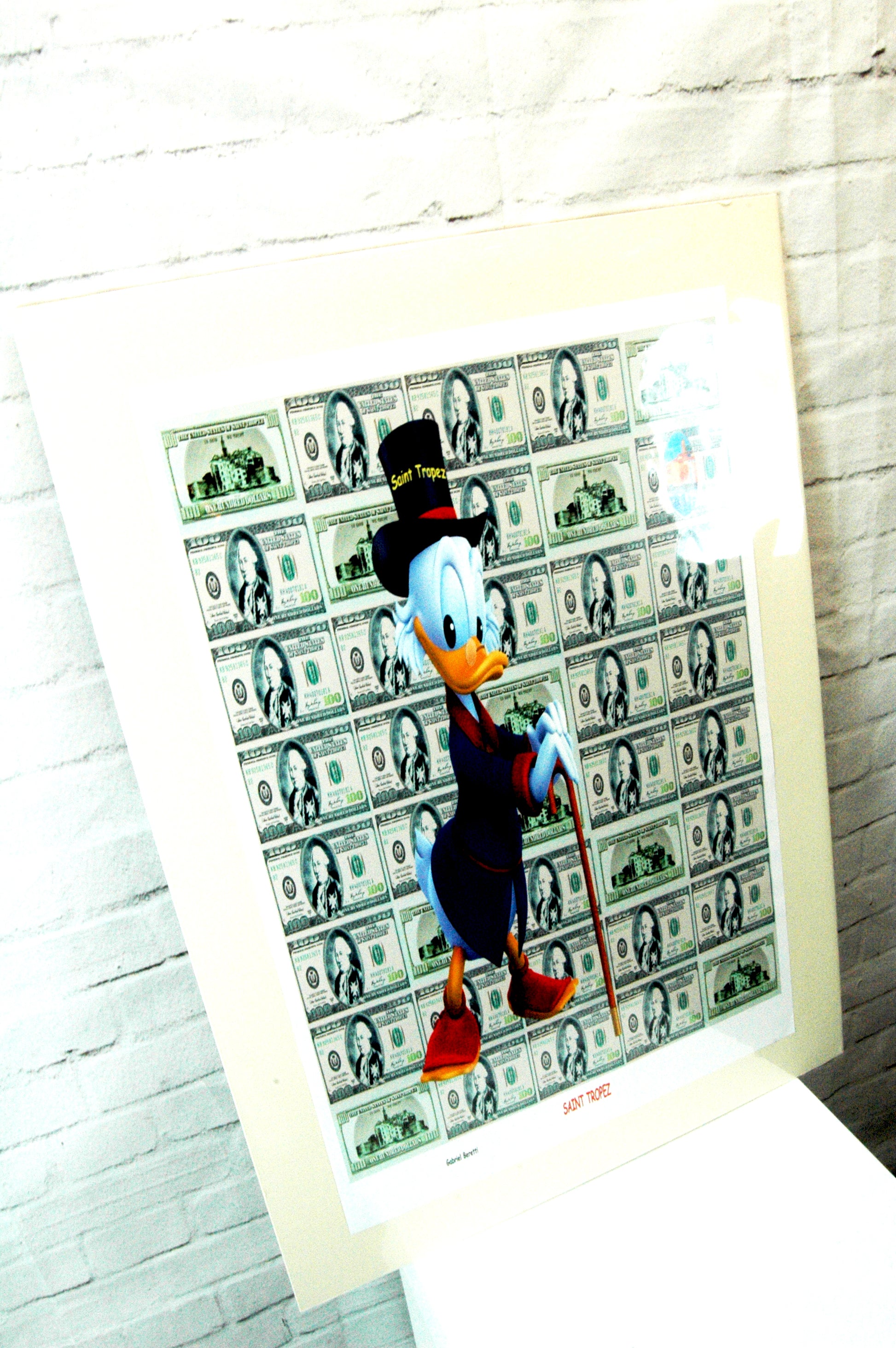 Même Picsou est heureux d’être à ST Tropez et il peut entrer dans l’univers de Gabriel, sur un fond de papier peint, on peut voir en haut, à droite une petite peinture du port Tropézien et Picsou, vraiment heureux d’être là.