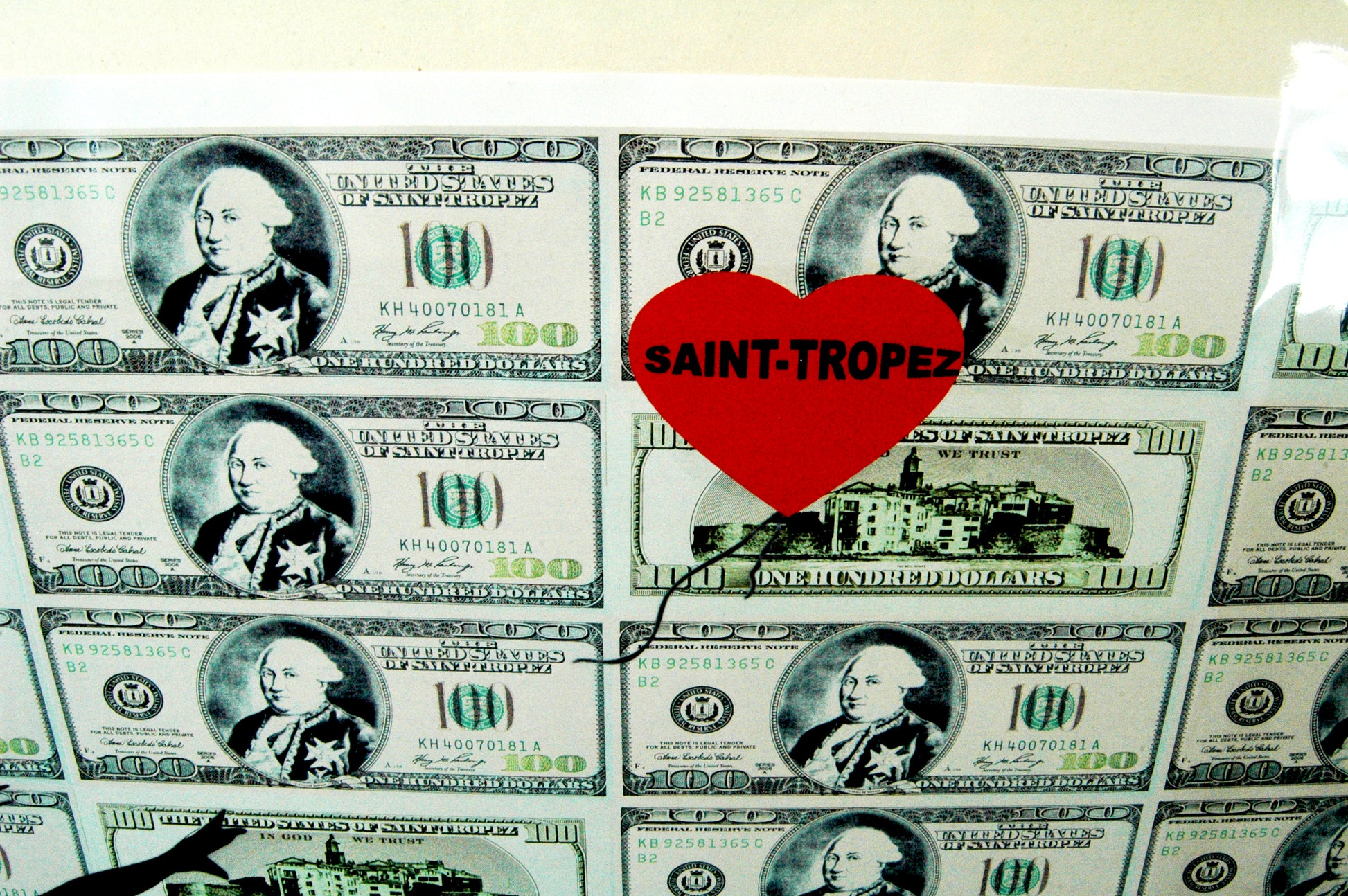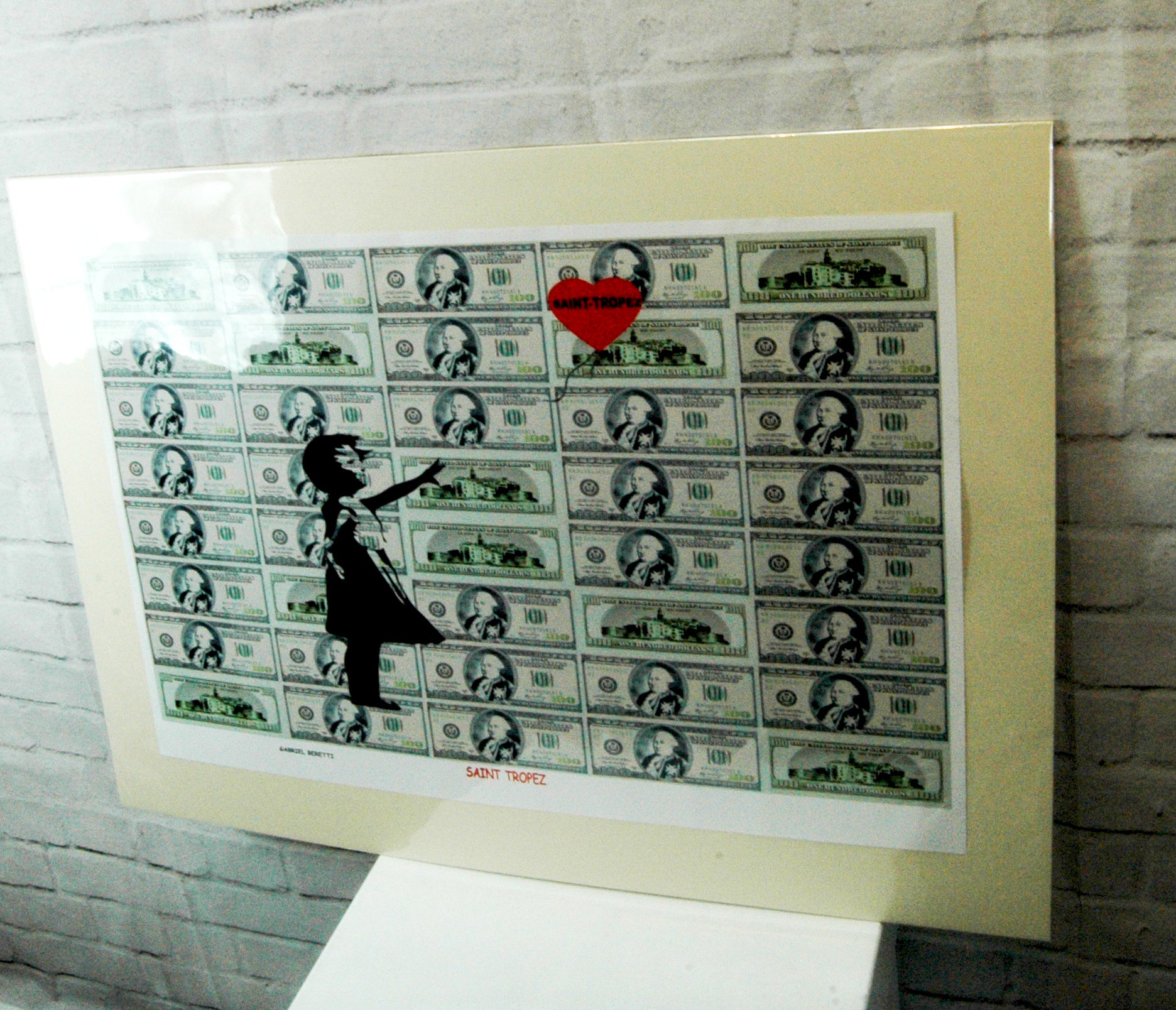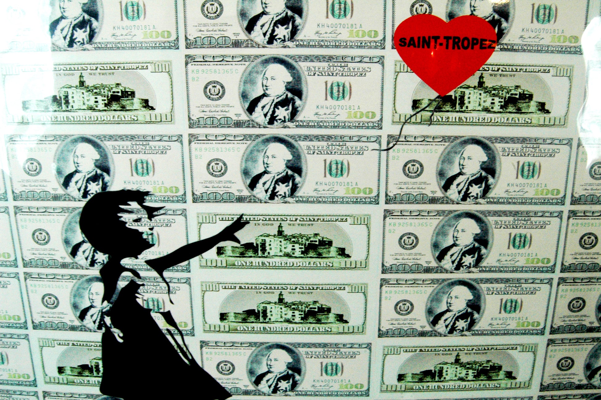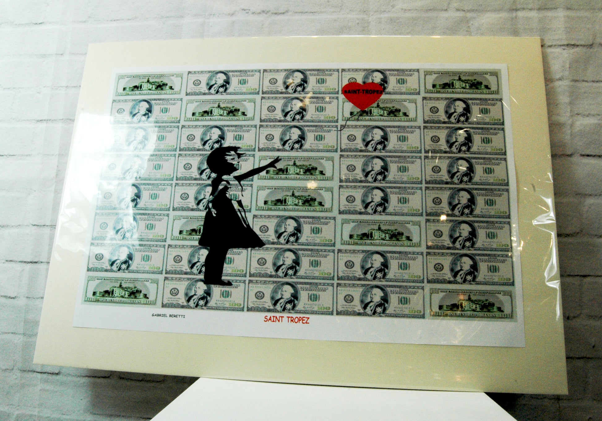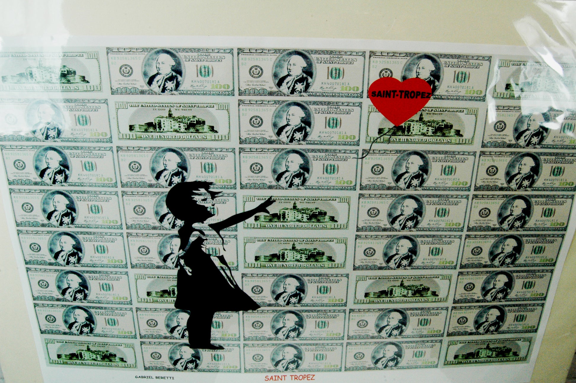 Gabriel a été séduit par : -la petite fille au ballon (célèbre pochoir connu du monde entier) pour créer une monnaie originale, qu’il a entièrement pensée en la plaçant à l’arrière-plan. On remarque l’émotion de la petite fille regardant s’éloigner son ballon de ST Tropez, symbolisant la tristesse de quitter ce village si captivant.